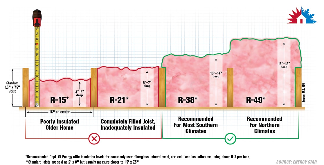 Insulation is rated in terms of thermal resistance, known as R-Value. The higher the R-Value, the better the insulating power. The amount of insulation advised for your home is primarily dependent on where you live, but as a general guideline, homes in a cold climate should have a minimum of R-49 in the attic and warmer climates only require an R-38. Here are the three main types of attic insulation available: